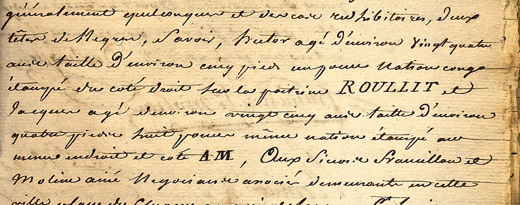 A second archival document tells us more about the lives of Roullit slaves, and others owned by the colonists of Saint Domingue. A sales agreement dated August 14, 1777, describes the sale of deux têtes de Negres, two male slaves, from Sieur Dastague of Gros Morne to Sieurs Francillon and Moline, négociants (businessmen.) The first slave is identified as Hector, about twenty-four years of age and five feet (French feet) in height, originally from the Congo, and étampé ROULLIT on the left side of his chest. The second individual is Jacques, about 25 years of age, close to five feet in height and also from the Congo, étampé AM in the same place and way. In the context of negres, étampé means branding the owner’s name into the flesh of the slave with a branding iron. The slave Hector carried the name ROULLIT branded on his chest to identify him as the property of one of the Roullits in the colony, prior to becoming the property of Sieur Dastague of Gros Morne. The uncommon nature of the name ROULLIT, and the fact that the sale occurred in Gros Morne, suggest that Hector was branded by Marie-Françoise-Catherine’s family, or by one of her relations. The archives of France and other nations are filled with thousands of documents detailing similar transactions and practices.