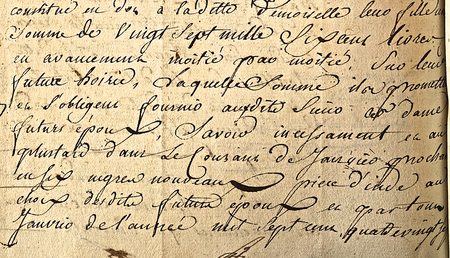 Contrat de Mariage entre M. Robillard et Mlle. Roullit, 1785, August 22 (detail) – DPPC NOT *SDOM 38. Image courtesy of the Archives Nationales (France)