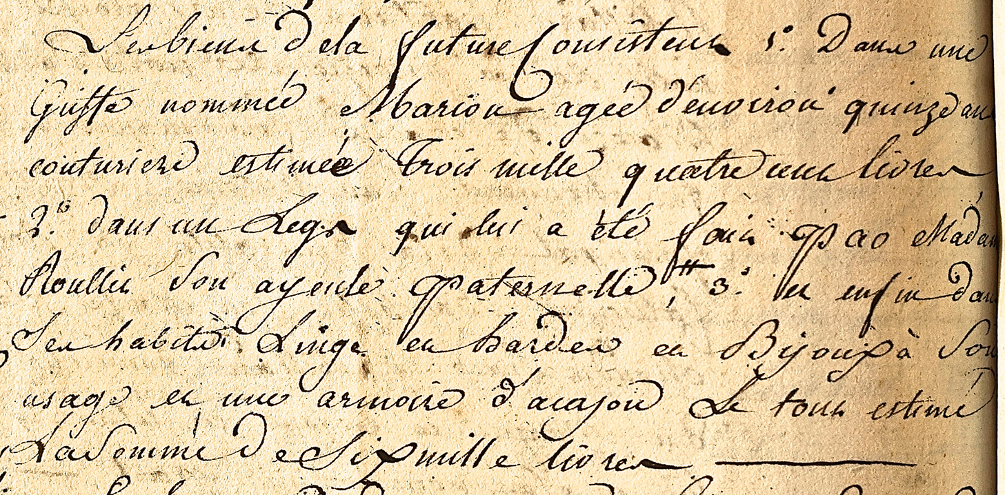 To her marriage, Marie-Françoise-Catherine Roullit brought slaves, an inheritance from her aunt, jewelry, clothes and other personal biens (goods) all together valued at six-thousand livres. The first item on Marie-Françoise-Catherine’s list of biens is: “…1°…une Griffe nommée Marion agée d’environ quinze ans, couturiere estimée trois mille quatre cent livres.” The slave “Griffe” carries different meanings according to different authors, but all refer to some form of mixed-race ancestry. Marion was about fifteen in 1785 and had been trained as a couturière, or seamstress. Marion carried a valuation of three-thousand-four-hundred livres.