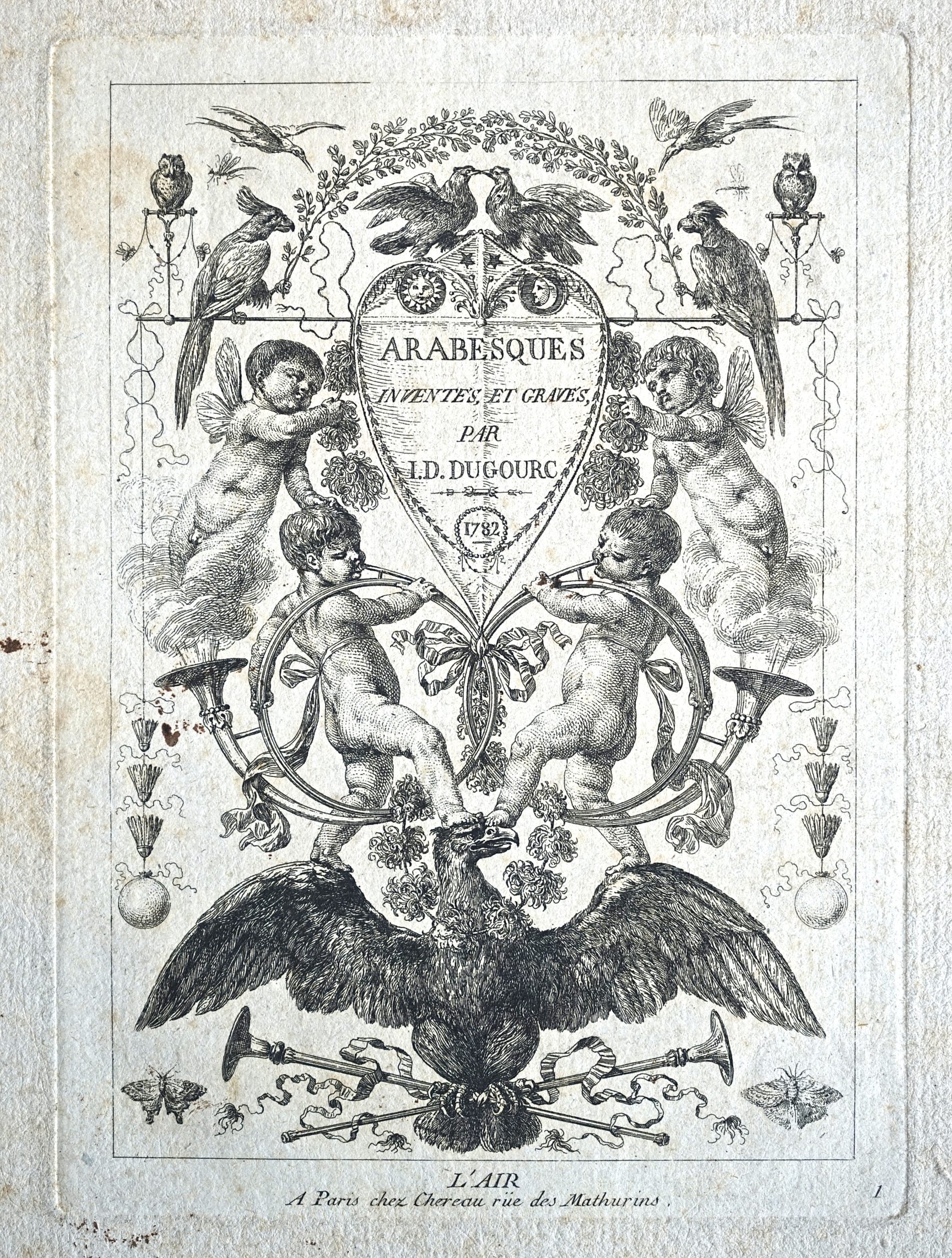 The image above is a promotional piece from 1782, and one of a group of six. Over the course of his career Dugourc worked in a variety of media – gold, ivory, fabrics, paper, and others. Trained as an architect, Dugourc designed carriages, clocks, chairs, funerals, and playing cards. Like Jacques-Louis David, Dugourc designed pageants for the powerful. His clients were typically wealthy and he often designed for royalty. Dugourc survived to serve the Bourbon rulers of France when they returned in 1814. Examples of his work can be found at Versailles, Paris Museums, and other sites. The most comprehensive study of Dugourc and his art is Christian Baulez’s 1990 exhibition catalogue: De Dugourc à Pernon: nouvelles acquisitions graphiques pour les musées: 1890-1990 centenaire du Musée des tissus.