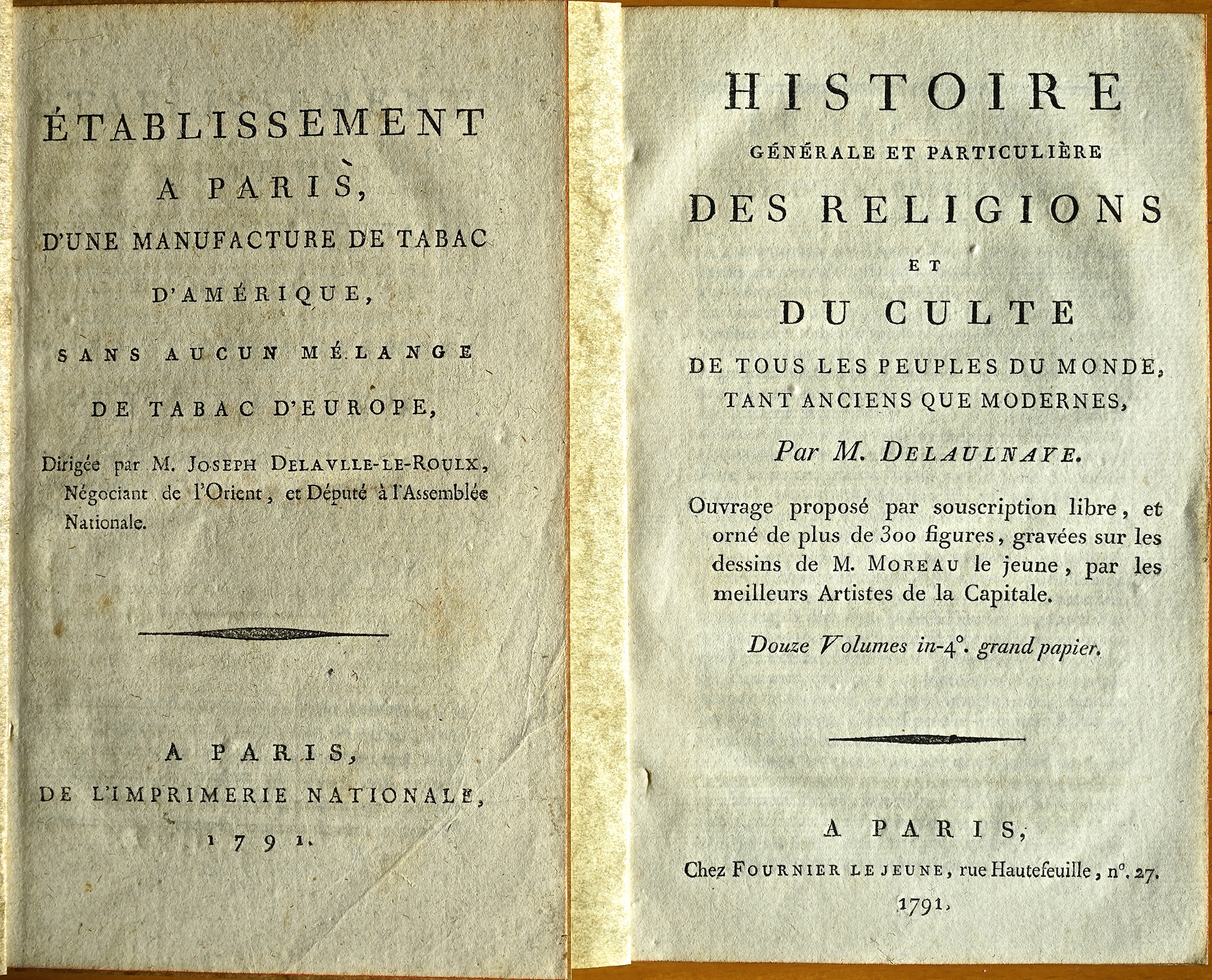 M. Delaulnaye invites consumers to subscribe to twelve illustrated volumes, published over time in 48 livraisons (issues). The late 18th century was a time of enormous ambition and excitement. Europeans had conquered India and were moving west across North America. Captain Cook mapped much of the South Pacific. Precision manufacturing and emerging technologies from England promised greater victories. France was keen to catch up; the educated public wanted reliable information about cultures and people, illustrated by the best artists. The prospectus for the General and Particular History of Religions and Cults… promises exactly that, with a total of 300 high-quality illustrations. Note the prominant position awarded Moreau Le Jeune (Jean-Michel Moreau) on the prospectus cover.