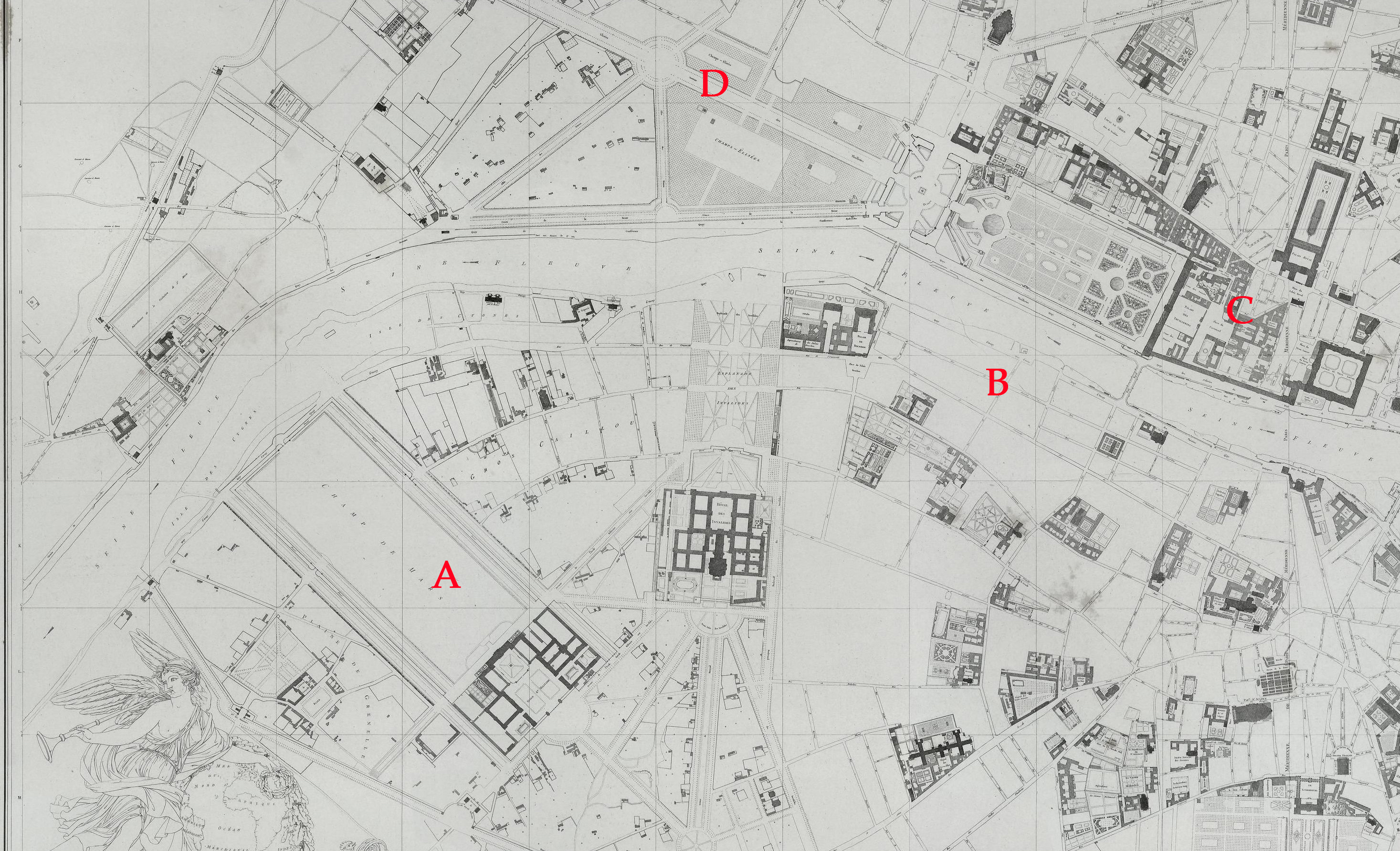A: Champ du Mars; B: Belle Chasse, Robillard-De Poix-Géricault-Caruel apartments; C: Hotel Longueville, Robillard-Caruel apartments; D: Champs-Elysées. Map: 1790 Verniquet (detail).