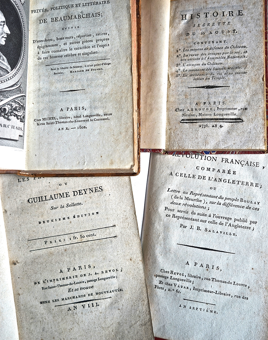 The first publisher to move into the Maison Longueville after Louis Rondonneau was probably the firm of Lerouge indicated above. The Imprimerie Lerouge is known primarily as the publisher of newspapers, rather than books. But proximity to the events of August 10th, 1792, may have inspired the firm to produce the slim volume the Histoire Secrette de 10 Aoust. We have not been able to locate any other books by Lerouge. The Lerouge firm was based first on the rue de Chartes close to the Hôtel de Longueville, then at the Hôtel de Longueville, and then on the Rue des Orties in front of the Galeries du Louvre. (The BnF Data entry for Lerouge is useful, but omits any mention the relocation to the “rue des Orties du Louvre” around 1797.) The two other firms, Revol and Michel, were principally booksellers who set up shop in the Passage Longueville around or after 1797, we believe. (See below and “Birth of a Street” in our March issue.)