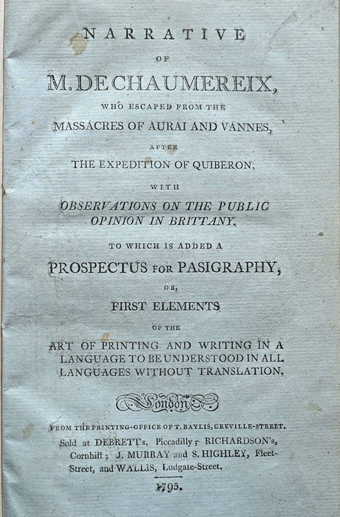 Cover of Jean-Hugues Duroy de Chaumereix’s 1795 account translated into English.