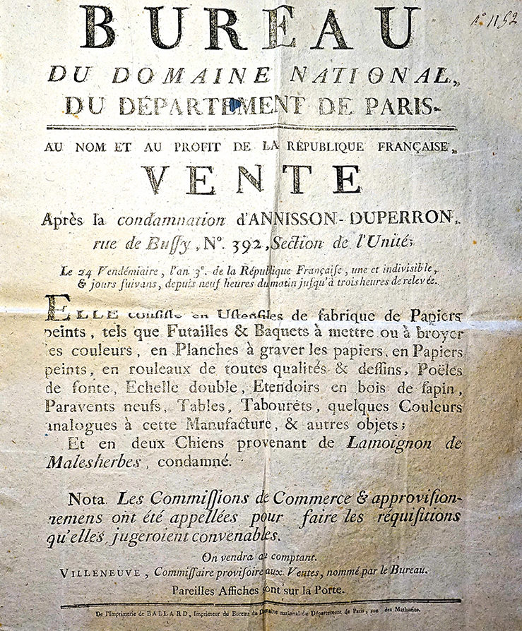25 Vendemiaire An 3 (October 15th, 1794) Affiche Vente de Biens Nationaux de condamné Annisson-Duperron. Image courtesy of the Archives Nationales (France) O/2/494.