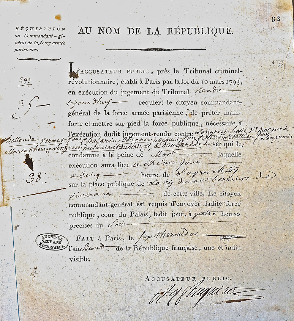 6 Thermidor An 2 (July 24th, 1794) Réquisition au Commandant-général de la force armée parisienne. Image courtesy of the Archives Nationales (France) AF/II/48 373 doc. 62.