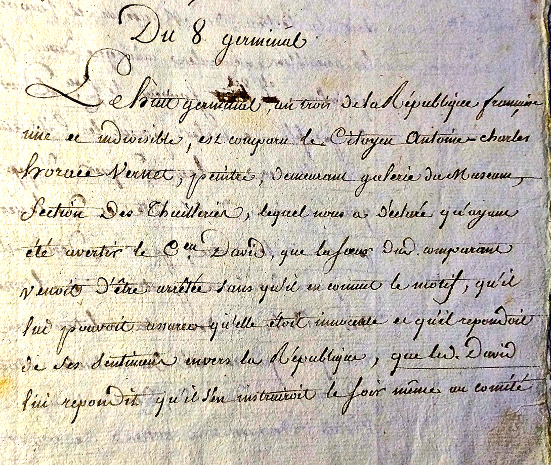 An 3 Germinal 8, (March 28th, 1795) Déclarations faites à…Section de Muséum – Cityoen Antoine Charles Horace Vernet (detail). Image courtesy of the Archives Nationales (France) AA//45 Doss. 1352A.